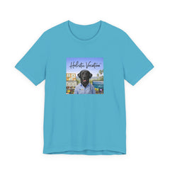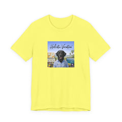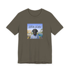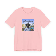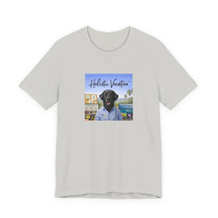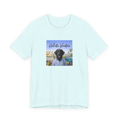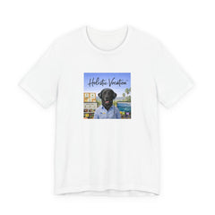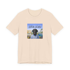 A soft, breathable cotton tee that carries a relaxed, sunlit vibe. The shirt features a square front print of a friendly black Labrador wearing a button-up shirt against a beachside town backdrop, with the script "Holistic Vacation" floating above. Lightweight Airlume combed and ring-spun cotton keeps the feel airy and easy to layer. The retail fit and crew neckline make it versatile for everyday wear — from morning coffee runs to lazy afternoons by the water. Subtle construction details like side seams, ribbed collar, shoulder tape, and a tear-away label keep the shirt comfortable and durable. Ethically produced with REACH compliance and responsibly sourced blanks.